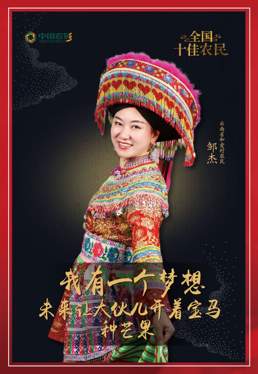 邹 杰 女,1977年9月出生,傈僳族,大专学历,云南省华坪县荣将镇和爱村农民,丽江华坪金芒果生态开发有限公司董事长。公司集芒果种植、销售、产品深加工于一体,拥有标准化芒果种植示范园区6000亩,生产车间最高可达到年生产芒果原浆7500吨、速冻果块3万吨、芒果干300吨。带动合作社300多户果农以及社外400多户果农增收致富。曾获云南省科技特派员、丽江市创业先锋等荣誉。